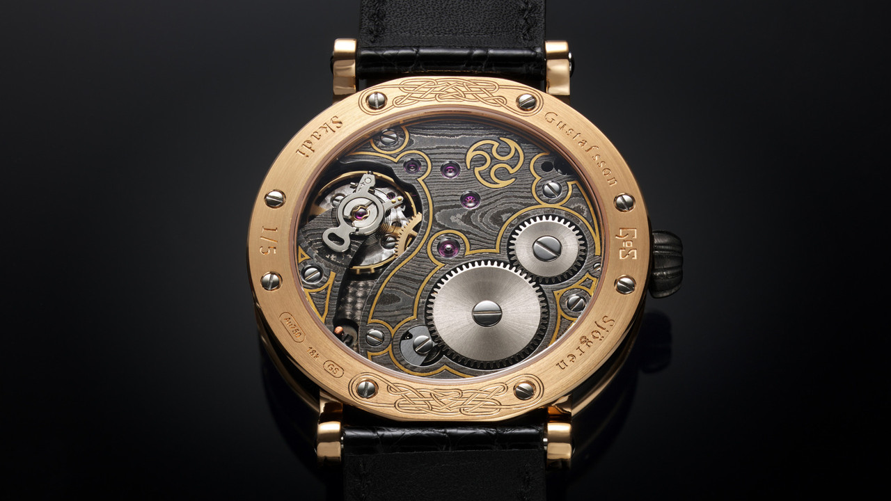 The engraving on both the lugs and movement are by master knife maker Anders Hedlund, who was also responsible for the engraving on the Sarek Trollius. Inspired by Viking shield decoration, both sides of the lugs feature a Viking knot pattern.