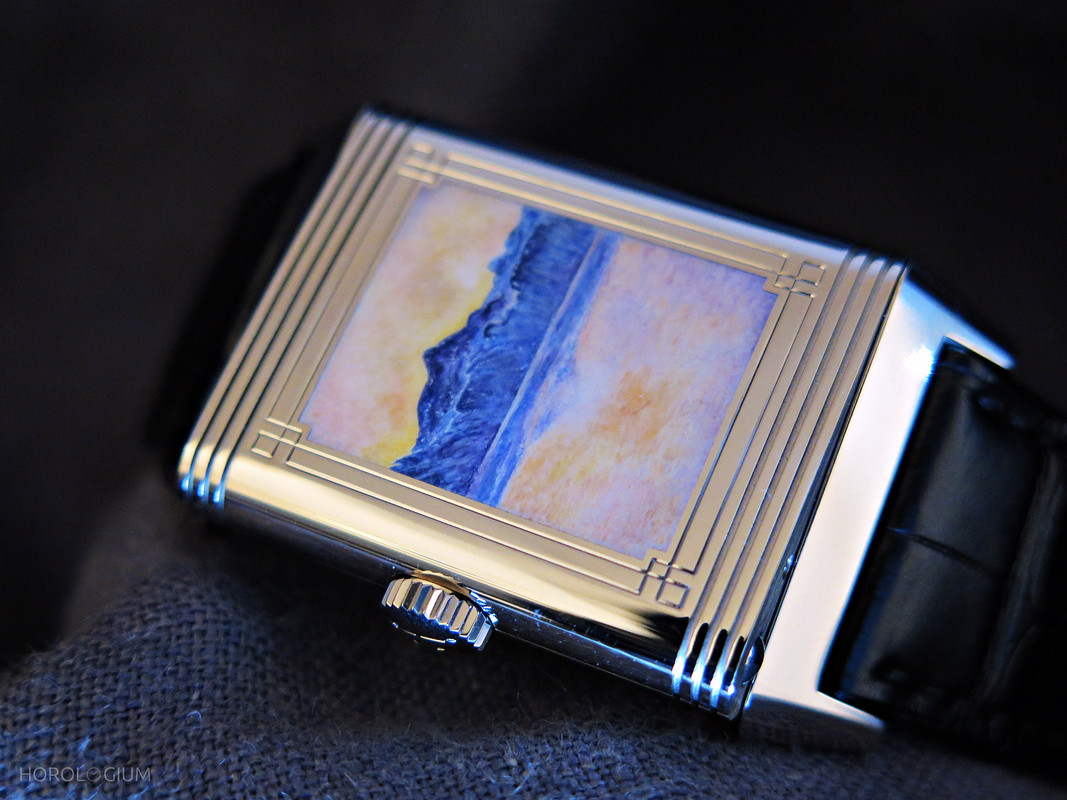 It is the one depicting Lake Geneva which has been here in Sydney, and thus timely for me to highlight today, when I would have otherwise been by its shores. Like its oil painting, which was completed in 1918, its miniature features pink and gold shades of the Lake as the sun rises. The original painting measures 74 cm x 150 cm, so as you can tell, a ratio amendment has had to be made for this homage. Jaeger-LeCoultre have done a number of miniaturised paintings on their Reversos over the years – some have been done with this orienatation and others, on the horizontal.