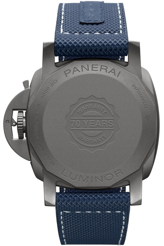 The case is micro-sandblasted titanium and 15.65 mm thick, with a water resistance of 300m. The back is screw-down micro-blasted titanium and engraved with “70 Years Warranty”.