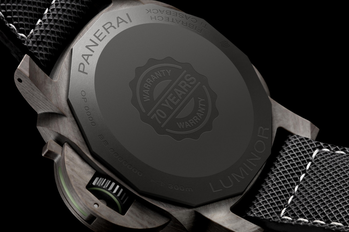 As is mostly the case for watch cases that are made of more unusual composite materials, the case back for the PAM1119 is titanium. Behind it is the same automatic Calibre P.9010 with a three day power reserve.