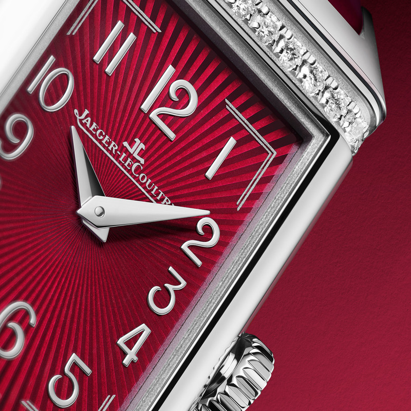 The dial features a sunray guilloché decoration which is coated with several layers of lacquer. The Art Deco origins of the Reverso are given an added lift with the addition of double lines at each of the corners. The use of very rounded Arabic numerals of varied sizes is intended to give the impression of the numbers having been sketched by hand.