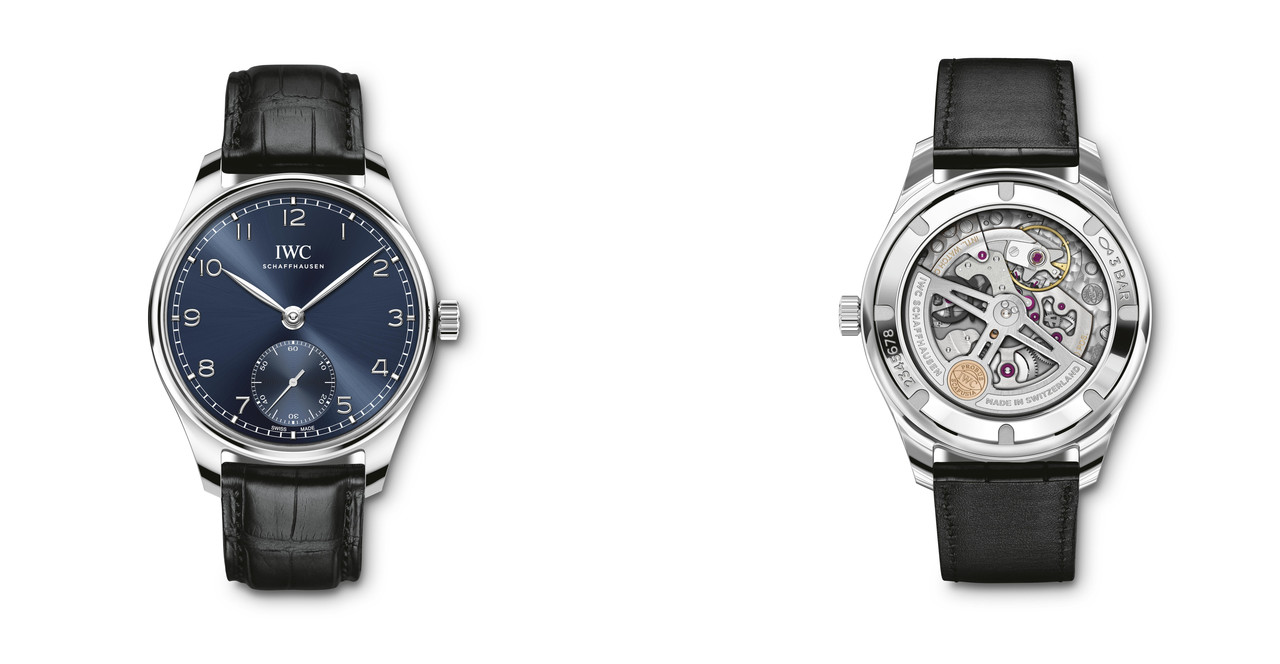 The ‘origin watch’ is the Reference 325, a watch created in 1939 by IWC at the request of two Portuguese wholesalers (hence the name). The brief was that it should be a large watch with the precision of a marine chronometer. Based on a hunter pocket watch movement (the Calibre 74), the result was what was a huge wristwatch for the time – 41.5m, with Arabic numerals and a small seconds.