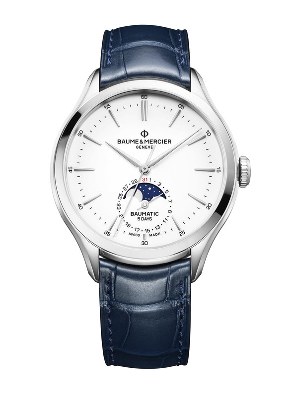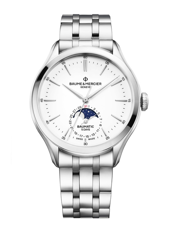 Next up is the more traditional looking new Baumatic Moon-Phase/ Date. It comes in a 42mm steel case that again, features a combination of polished and satin finishing. It has a porcelain look white dial with rhodium plating on the trapezoidal indices, hands, and moon-phase disc.
