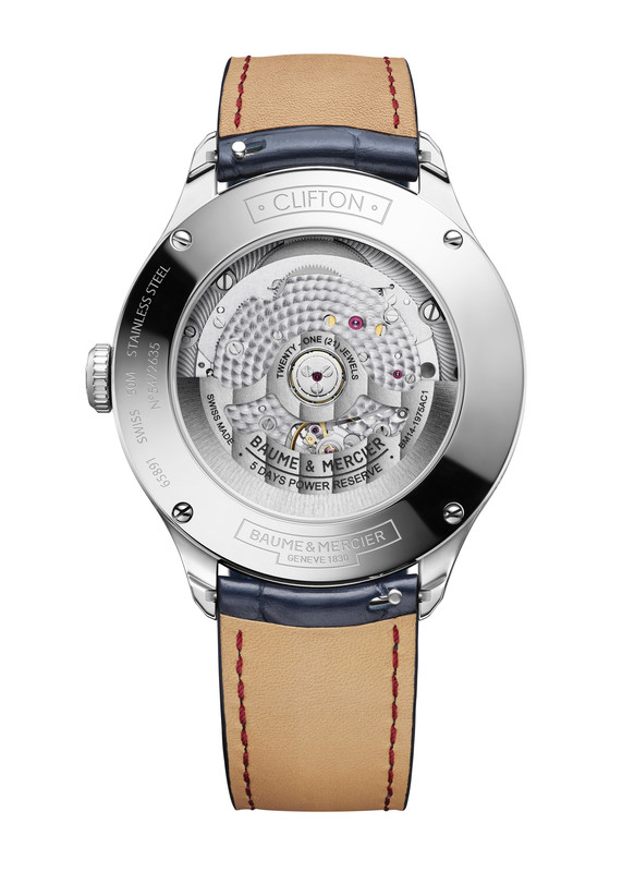 Inside is the new automatic Baumatic Calibre BM14 1975 AC2, which has a bridge with circular graining, sand-blasted plate with snailed decoration, and a gilt open-worked oscillating weight with Côtes de Genève finishing. It beats at 28,800 VPH and has a power reserve of five days.