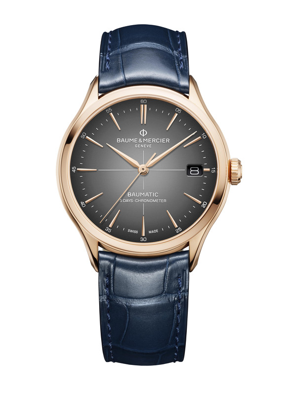 Finally, there is a new version of the pink gold Baumatic Date COSC in slightly smaller (39mm) and slightly thinner case with the grey gradient dial, gilt indices and hands, on an alligator strap with a 5N PVD pin buckle.