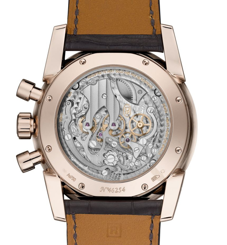 Inside the 43mm sized (thickness of 13.4mm) 18 kt rose gold case timepiece is the manually wound Calibre PF354, which beats at 21,600 VPH and has a power reserve of sixty-five hours.