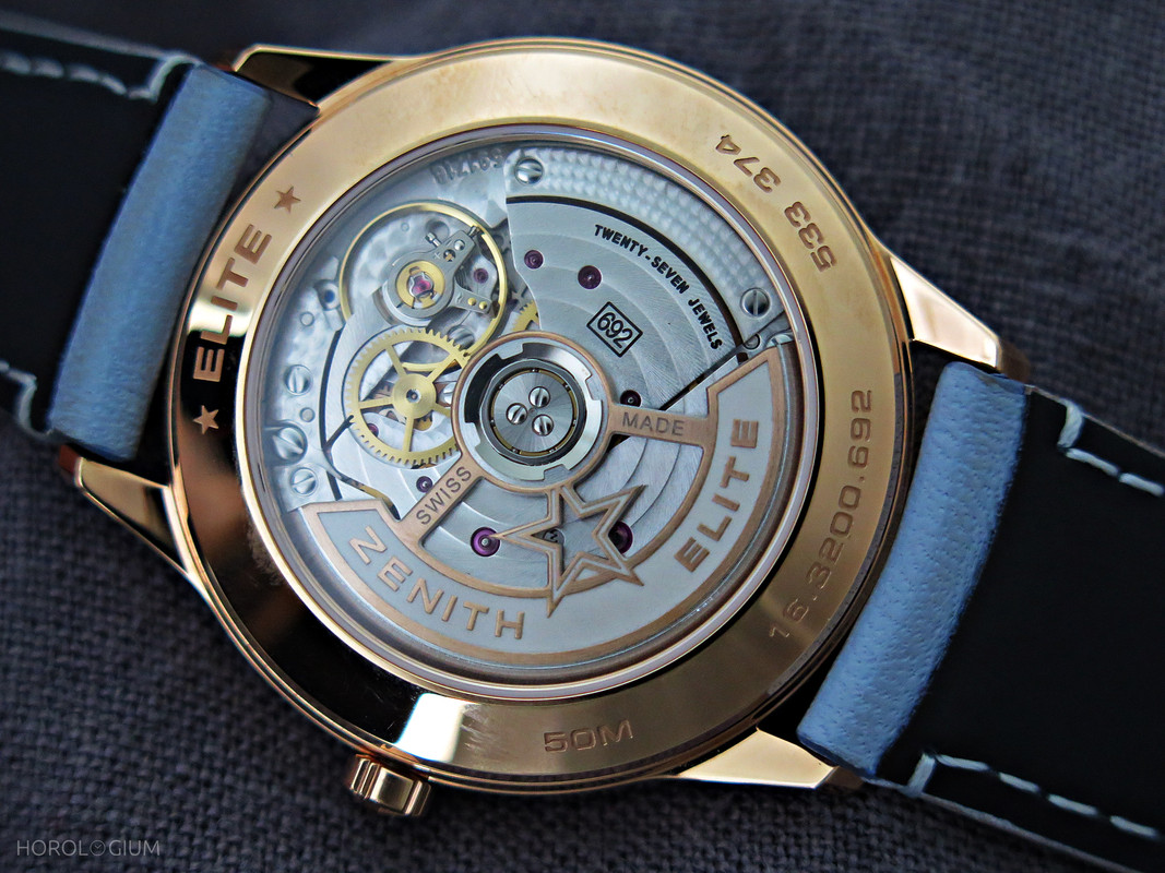 Inside is the automatic Elite Calibre 692, which beats at 28,800 VPH and has a power reserve of 50 hours. It features a newly designed star-shaped oscillating weight with satin finishing.