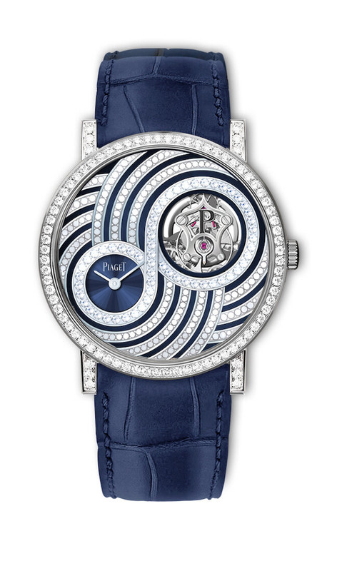 The second Piaget Altiplano Tourbillon Infinite Blue is limited to 18 numbered pieces and the infinity theme becomes a stylised part of the dial, which features diamond swirls. This eye-catching piece has 72 brilliant-cut diamonds (approx. 1.61 carats) set in the case, a dial with 179 brilliant-cut diamonds (approx. 1.64 carats), a crown with a brilliant-cut diamond (approx. 0.09 carat), and the buckle with 24 brilliant-cut diamonds (approx. 0.05 carat).