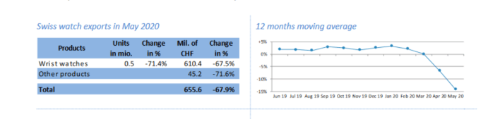 The effects of COVID-19 on Swiss watch exports this year continued through May, with exports dropping 67.9% compared to the May 2019, following April’s 81.3% fall. The FH have called the last two months periods of “quasi paralysis”. Overall, exports fell by 35.8% over the first five months of the year.