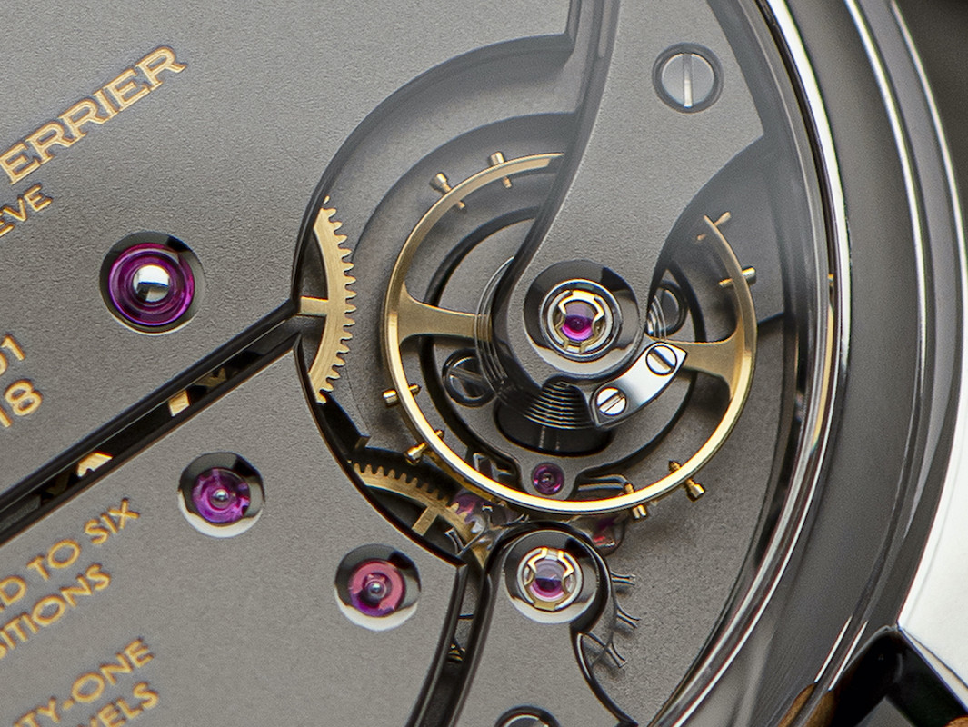 The dial is clean and very classically Ferrier. It is white-silver opaline and features their spear-shaped Assegai hour and minute hands. The Arabic numerals on the dial’s light-gray minutes/ 24-hour railway track are etched into the dial and painted in a burgundy colour. The grey of the track is mirrored in the grey of the crosshairs. There is a small seconds sub dial at 6 o’clock with baton-shaped hands. All hands and the applied markers at 12, 3 and 9 o’clock are 18k white gold.