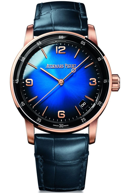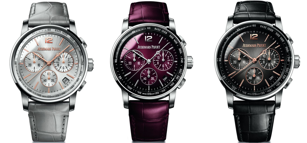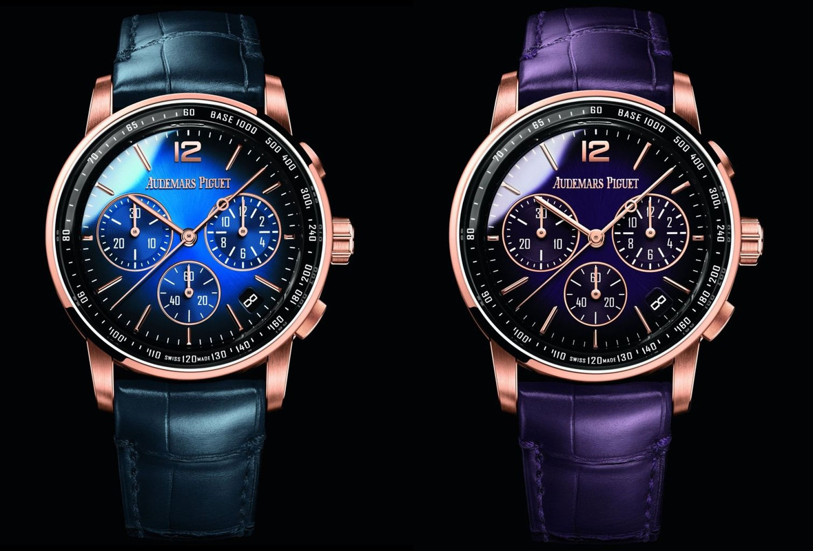 Now, a year later, Audemars Piguet have added five new CODE 11.59 Selfwinding references, and five new Selfwinding Chronograph models. They feature new smoked lacquered dials with sunburst patterns in blue, burgundy, purple, and two shades of grey. Yes, if you hadn’t noticed already, the popularity of sunburst/ graduated colour dials is continuing.