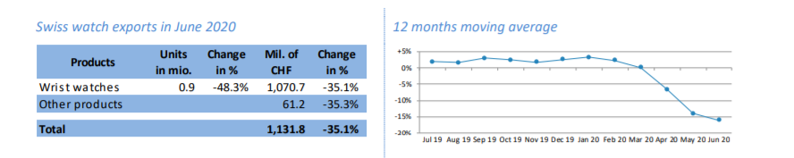 After the expected dramatic falls in May 2020, the Federation of the Swiss Watch Industry (FH) reported that watch exports continued to fall sharply in June, with the value falling 35.1 per cent compared to June 2019, to CHF 1.1 billion. An increase of 47.7 per cent for Mainland China was not enough to offset the drops in other markets such as Hong Kong, which went down 54.6 per cent, the U.S., down 57 per cent and the U.K., down 44.7 per cent. Germany (-21.3 per cent) and Singapore (-26 per cent) performed slightly better than average.