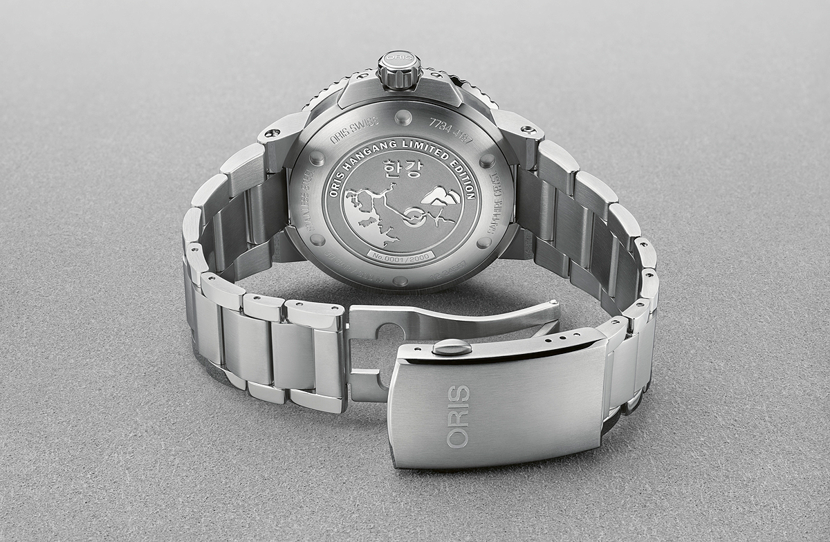 On the case back is an engraving of a map of the Hangang’s path across Korea, and the limitation number. Underneath it is the automatic Oris Calibre 743 (base Sellita SW 220-1) which beats at 28,800 VPH and has a power reserve of 38 hours.