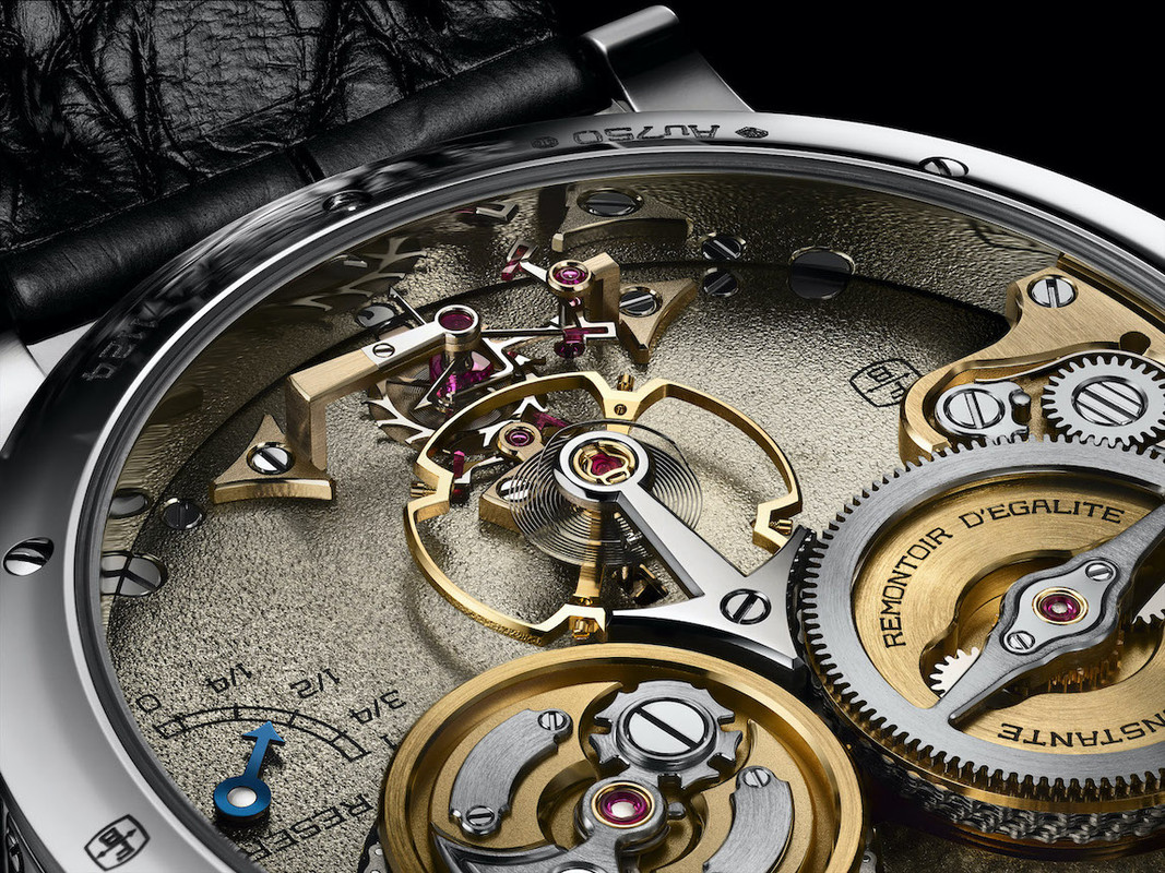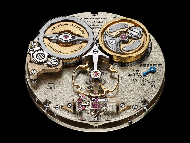 It comprises of twenty-six bridges held by ten steel pillars, a construction based on the original Ferdinand Berthoud marine chronometers by which it is inspired. It combines a constant force fusée-and-chain with a one-second remontoir d’égalité. There is a patented suspended fusée differential winding system, which is equipped with a Maltese Cross stopwork that protects the movement by limiting the winding of the mainspring to six turns, and acts as a buffer when the barrel is fully wound. The FB-RE.FC movement’s patented barrel and fusée are both suspended, attached on one side to the main plate.