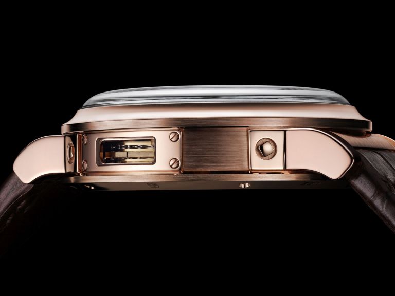 The hour and minute hands are either in CVD-blued 18kt white or in rose gold depending on the model, and the deadbeat seconds hand in CVD-blued or gilded titanium. Both variants have an arrow-shaped power reserve hand in CVD-blued 18kt gold on the back of the movement. The stop-seconds means that when you pull out the crown, the balance stops whilst you adjust the time, before recommencing once the crown is back in place.