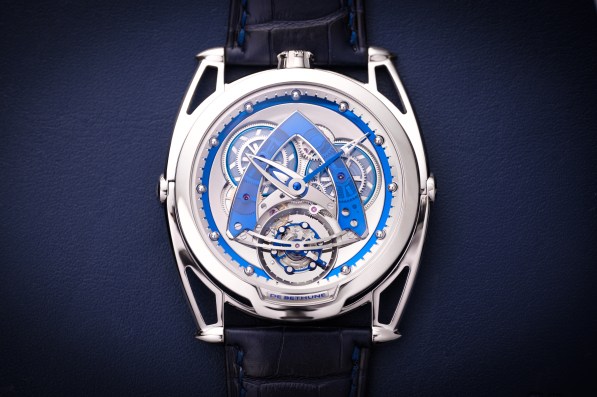 The use of sapphire for watch cases has become a bit of a niche ‘thing’, but what De Bethune have done here is much more unusual. To use blue is fitting, but to manage to get it to that blue which is associated with them is what really makes this special. Ever present behind the scenes at De Bethune since it was founded, Denis Flageollet designed the sapphire components, which are laser cut to specifications after which they are encircled polished titanium. The thicknesses of the sapphire crystal varies, with that of the bridge 1mm thick and for the barrel covers, 0.3mm thick. Thin they may be, but they are nonetheless created to be rigid enough to withstand the ‘wrist shocks’ of everyday wear.