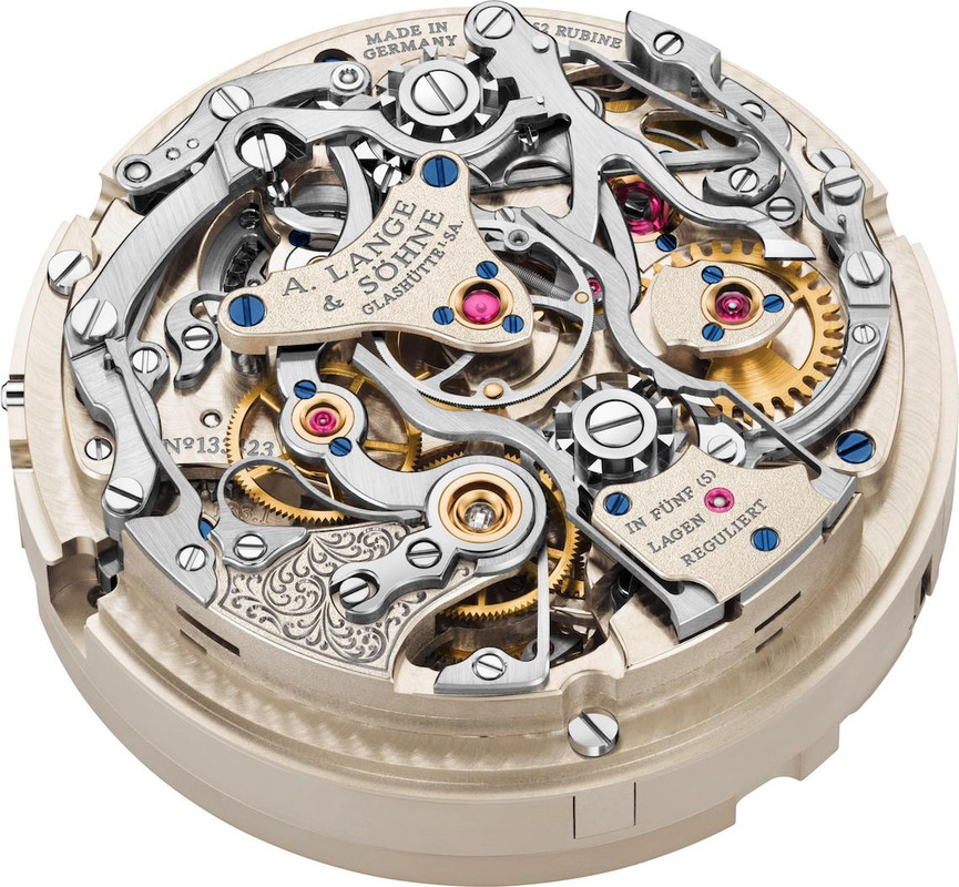 The new movement is the manually wound Calibre L101.2. With 365 parts, it beats at 21,600VPH and has a power reserve of fifty-eight hours. As you would expect the plates are untreated German silver, the hand-engraved balance cock is accompanied by an engraved chronograph bridge, and both are treated with black rhodium. Because it is visible through the open case back, as it should be for such a movement and complication, you can see the rattrapante function at work.