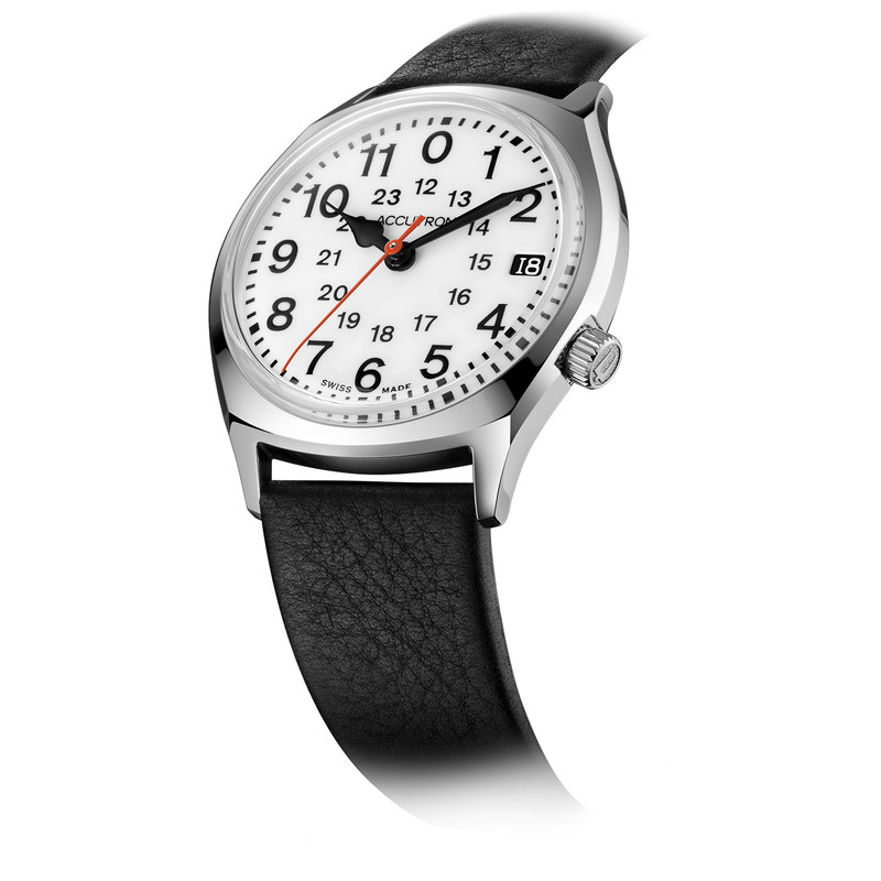 The R.R.-O is based on a 1970 design for the Canadian Railroad, and the general design features of it will be familiar not just to vintage Accutron collectors and enthusiasts. In a 34mm stainless steel case, it has a clean white dial with large Arabic numerals on the outer track, along with an ‘0’ at 12 o’clock as per the original specs. The inner ring is for 12 to 24 hours. The same movement as with the other pieces is visible behind the open case back.