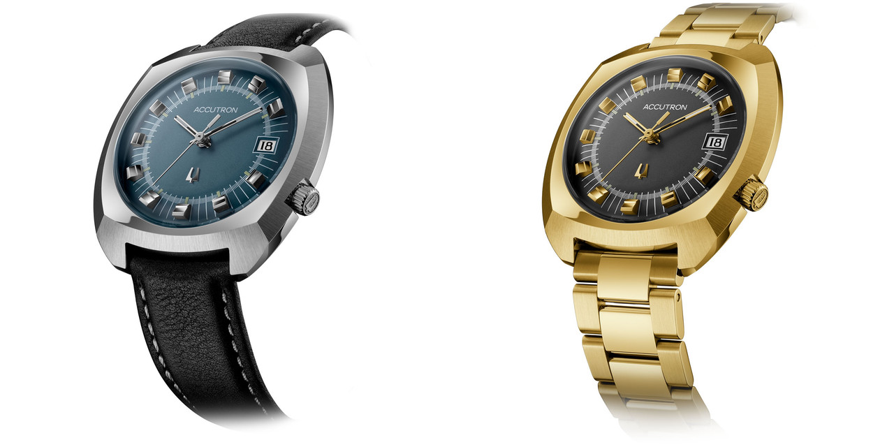 First up – Accutron has updated the 261 (1971) by retaining the 38.5mm cushion case size but with the new movement. There are two variants; a stainless steel one with a dark teal dial and a gold toned case with a black dial. They have squared-off applied hour markers, and domed sapphire crystal on both front and back.