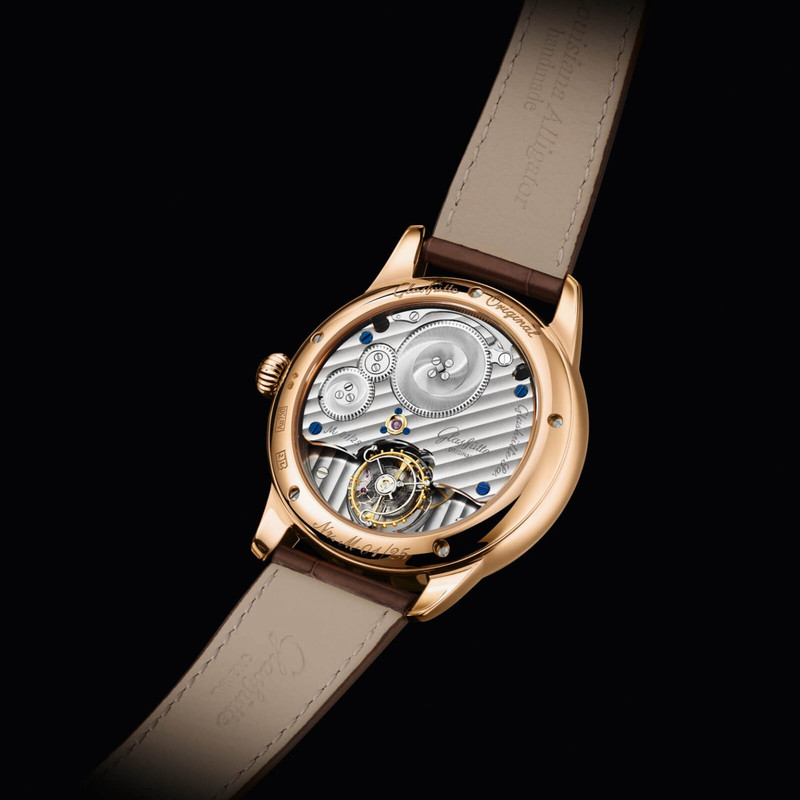 Coming in a 40mm sized rose gold case with a thickness of 10.6mm, this is pure elegant dress watch territory, with this new model featuring a flying tourbillon visible only from the back, the dial, which is solid gold with a silver-plated finish. Simple and classic. There is a railroad chapter ring, baton hands in rose gold, and a seconds display at 6 o’clock. The ‘Tourbillon’ inscription here as an indication of what lies beneath is perhaps the one thing that might divide people – those who think it’s a nice hint versus those whose liking for a discreet tourbillon visible only from the back extends to not mentioning its presence on the dial.
