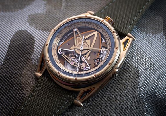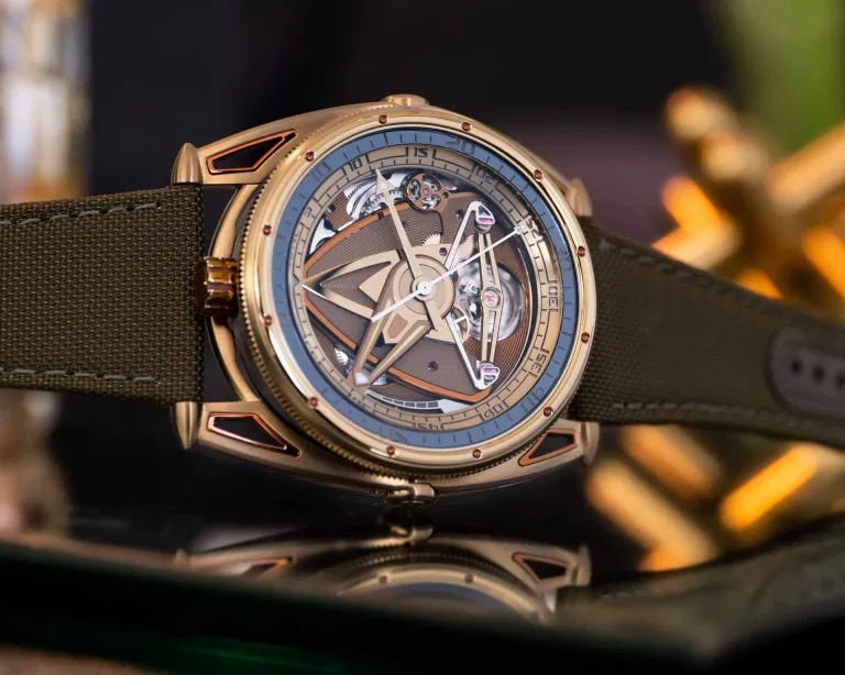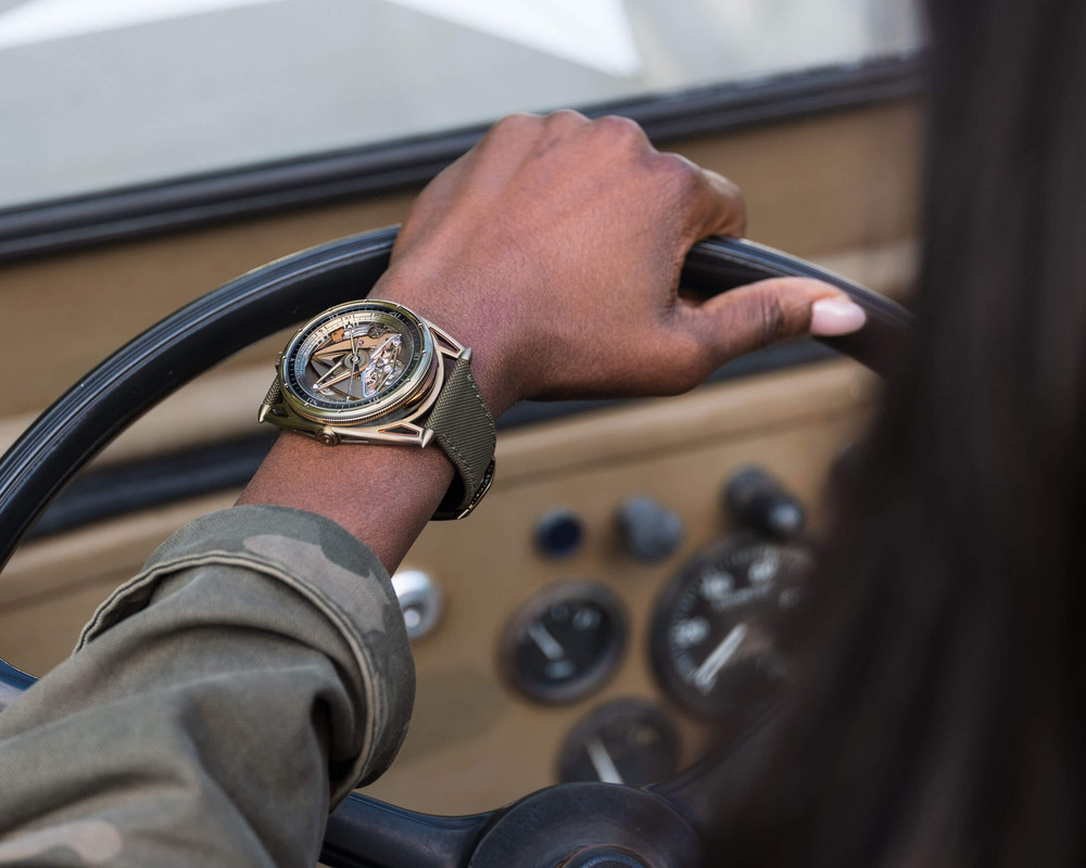 Their first venture into yellow, created through thermal oxidation of grade 5 titanium, was used in ‘Yellow Tones’. The ‘Yellow Submarine’ has this same treated titanium used for the bezel, open case back, lug inserts, dial, hands and buckle. The middle of the 44mm sized case (thickness of 12.8mm) is black Zirconium.