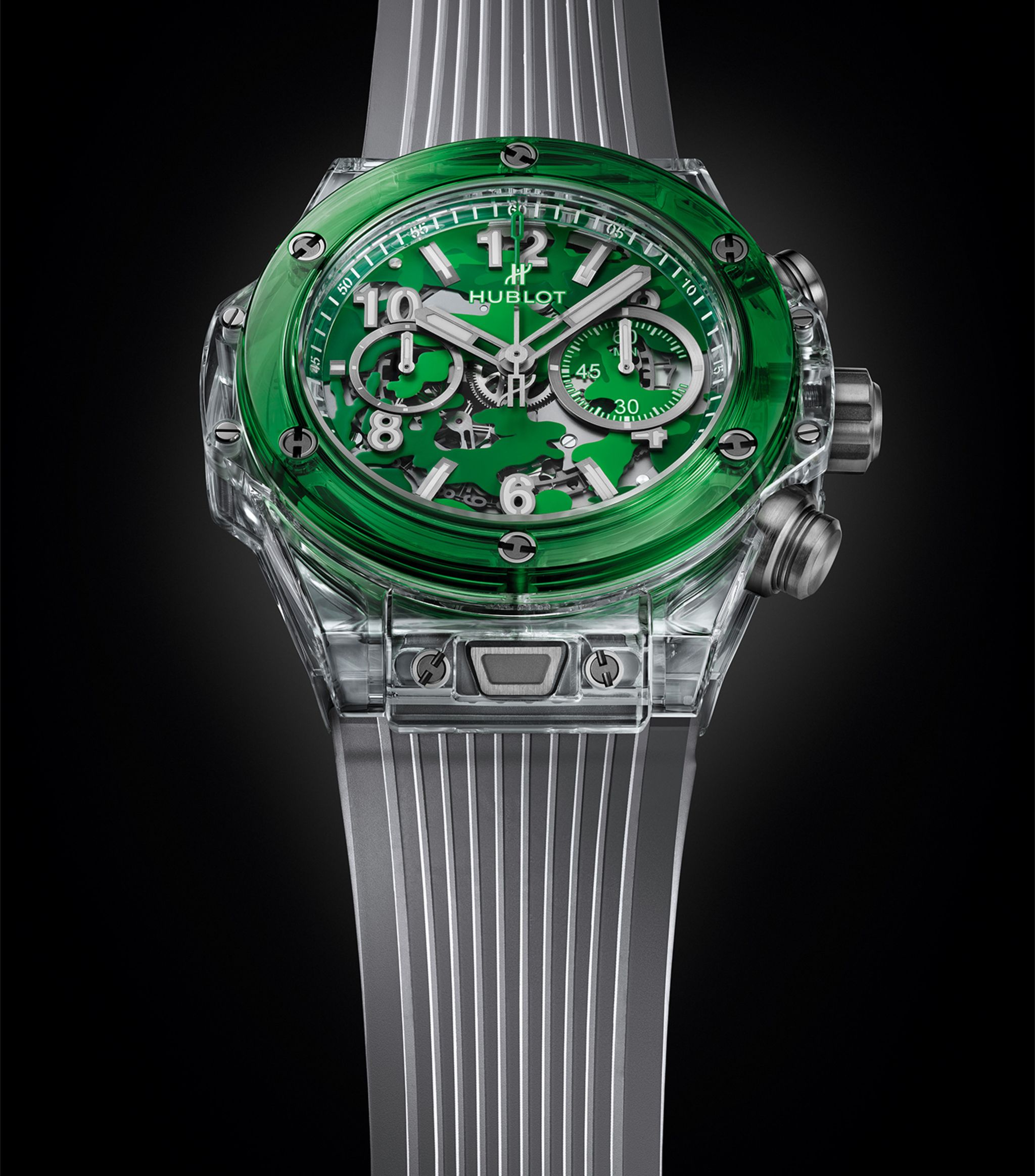 To recap what we covered previously, the SAXEM of which this new Big Bang Unico’s 45mm case is made is a Hublot-trademarked term stands for Sapphire Aluminium oXide and rare Earth Mineral. It is a very hard alloy that is the mixture of aluminium oxide (the building block of synthetic sapphire) with rare earth minerals such as thulium, holmium and chromium. Unlike the Spirit of Big Bang Green SAXEM however, its case is a combination of clear and green sapphire.