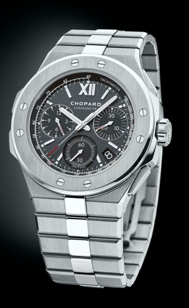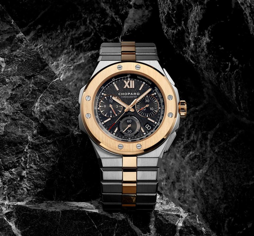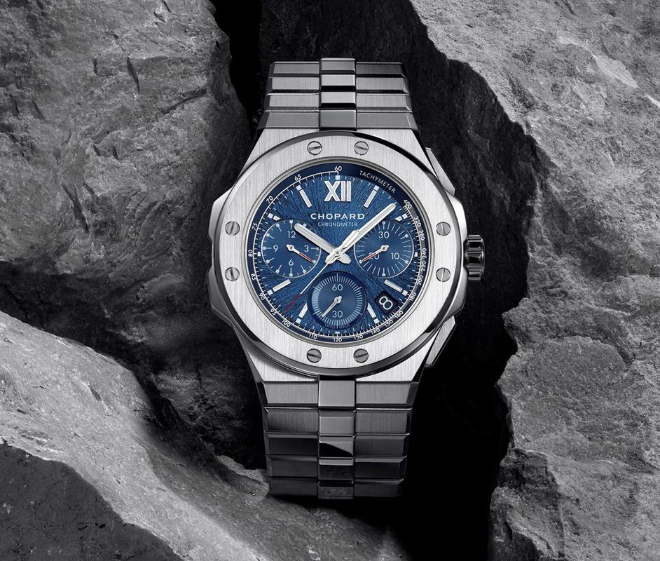 The new XL Chrono is in three variants – two in Lucent steel (one with an Aletsch blue dial, the other in Pitch Black), and the third in Lucent Steel and the Chopard Fairmined rose gold. The colour names refer to the deep black nights in the Alps, and ‘Aletsch blue’ refers to Switzerland’s largest glacier of that name.