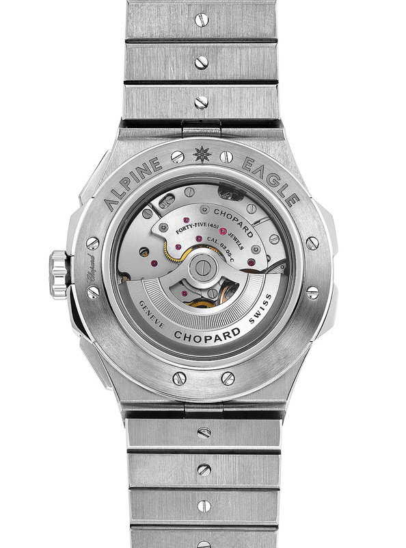 The Alpine Eagle recalls the original, but with an updated design, and it brought in a new material called Lucent Steel. There are still eight screws on the bezel, but the bezel is now round. The case has discreet ‘ears’ on either side which on the right, also protect the crown. The watches all feature integrated cases and bracelets with satin-finished ingot-shaped links, and a slightly raised and polished centre link. The crown is engraved with the compass rose motif. The hour/ minute hands, and the numerals, are coated with Super-LumiNova.