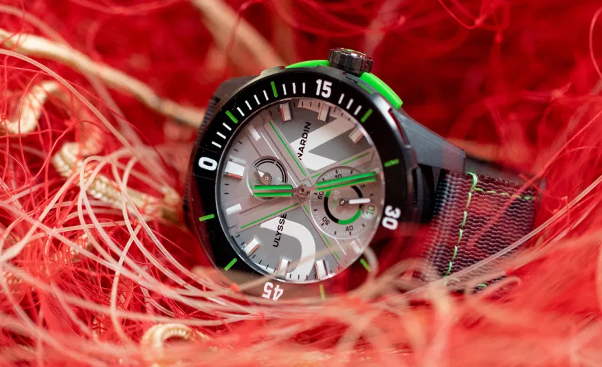 Meet Ulysse Nardin’s new concept watch the Diver NET, with the case, back, bezel and strap made from recycled fishing nets. Also, a crystal that is not sapphire but ceramic glass.