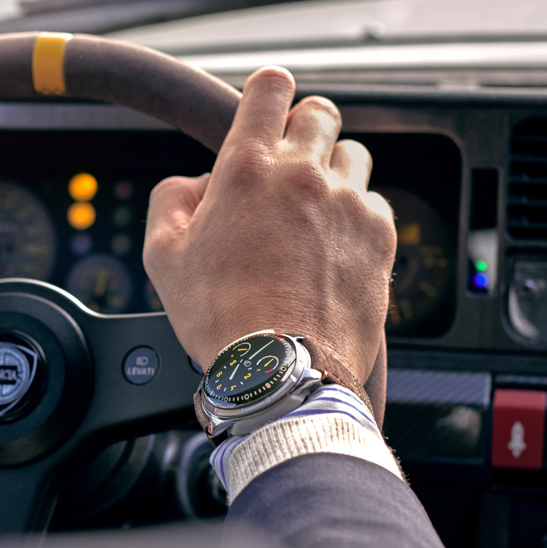 The new bezel is the key part of the watch. The markings relate to the Lancia Delta Futurista and the functioning of the turbos. The bezel is divided into two distinct parts. The first one is dedicated to the warming up of the engine (15min), with ‘S’ for ‘Start’, ‘D’ for ‘Drive’ and ‘R’ for ‘Race’. The second part is about the cooling of the turbos (10 min).