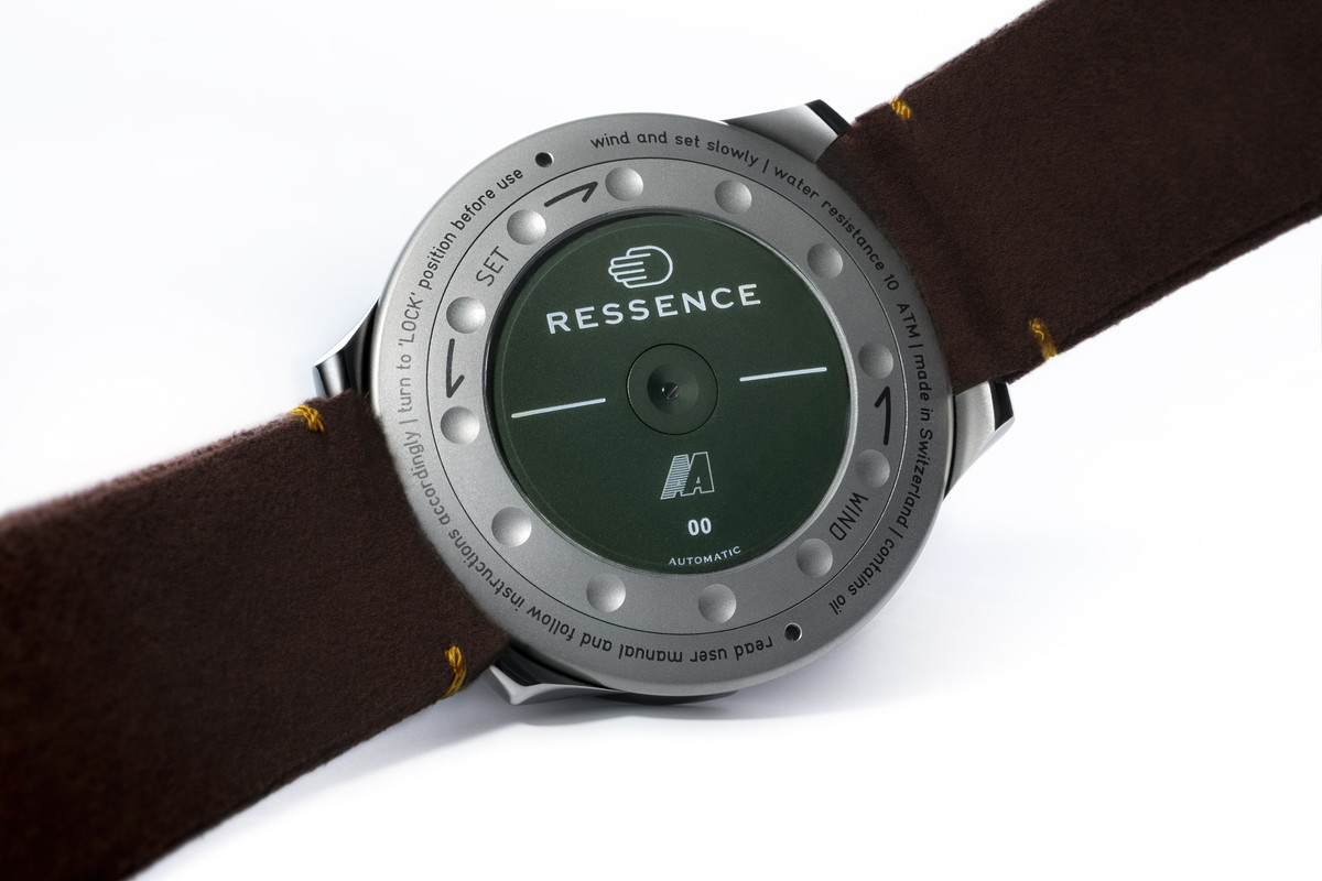 On the back, along with the watch and Automobili Amos branding, is the Ressence RCLS case back winding and time setting system. Beneath it is, as expected, the modified Calibre 2824/2 with a ROCS5 module that has a power reserve of 36 hours. There is a compensating (seven) bellow system for the oil.