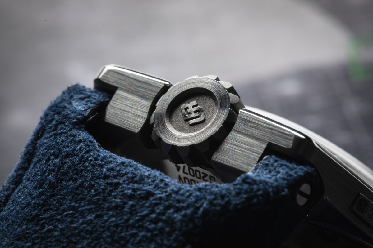 Inside the UR-100V Iron’s 41mm x 49.7mm x 14mm case is a modified version of the movement in the earlier models. The new automatic Calibre 12.02 also beats at 28,800 VPH and has a power reserve of 48 hours. It has a redesigned carousel (which carries the three satellites for the wandering hours), with the hours closer to the minutes. Both the carousel and the structure on top of the hours are made of anodised aluminium which has been sanded and shot-blasted. The satellite screws are each circular sanded and the structure on top of the hours display is in sanded and shot-blasted aluminium. The satellites themselves are on beryllium-bronze Geneva crosses; aluminium carousel; carousel and triple baseplates in ARCAP alloy.