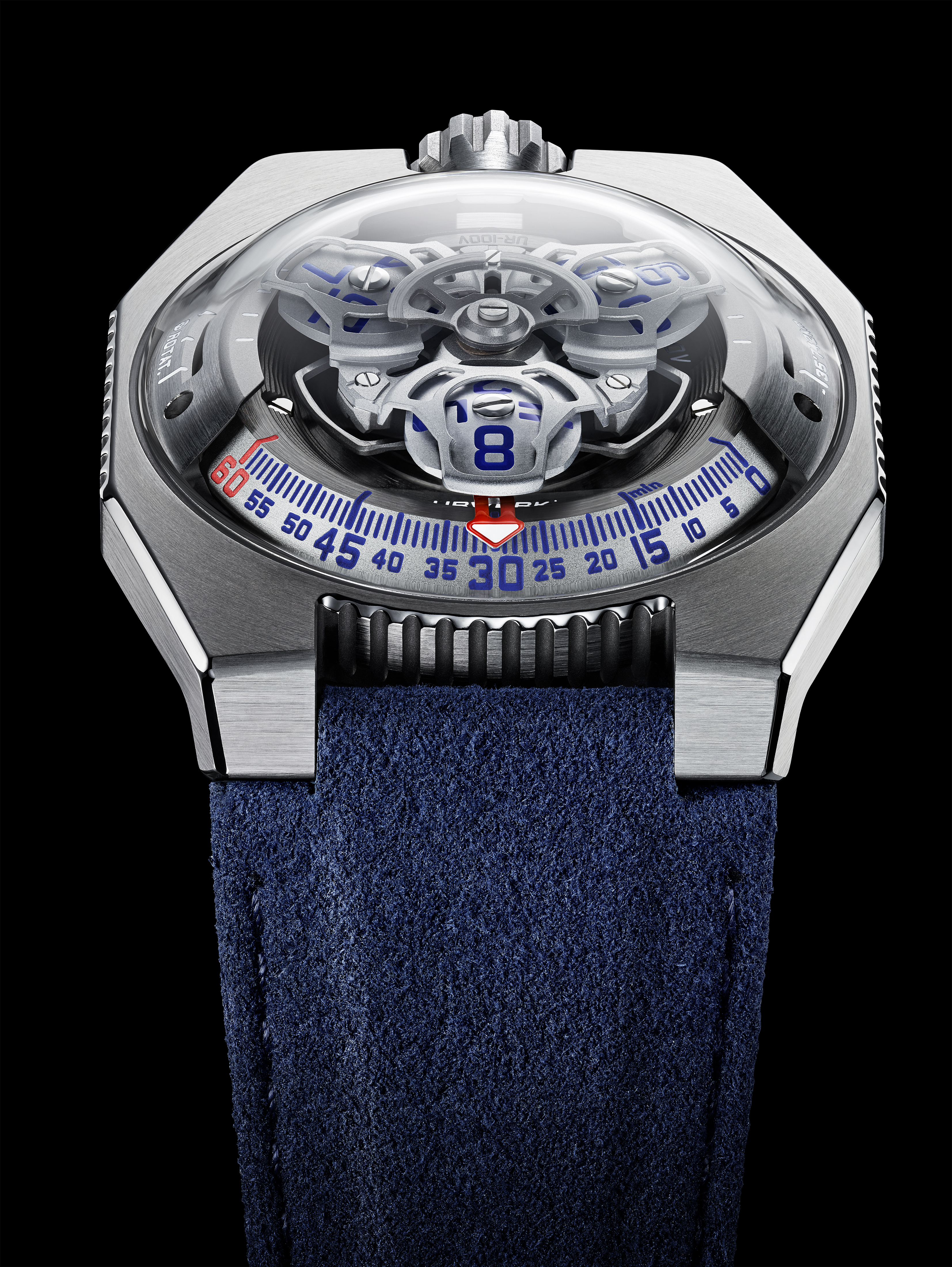 Coming on a blue Alacantra with a titanium buckle, the new UR-100V Iron is limited to twenty-five pieces and has an RRP of CHF 48,000 (excluding taxes).