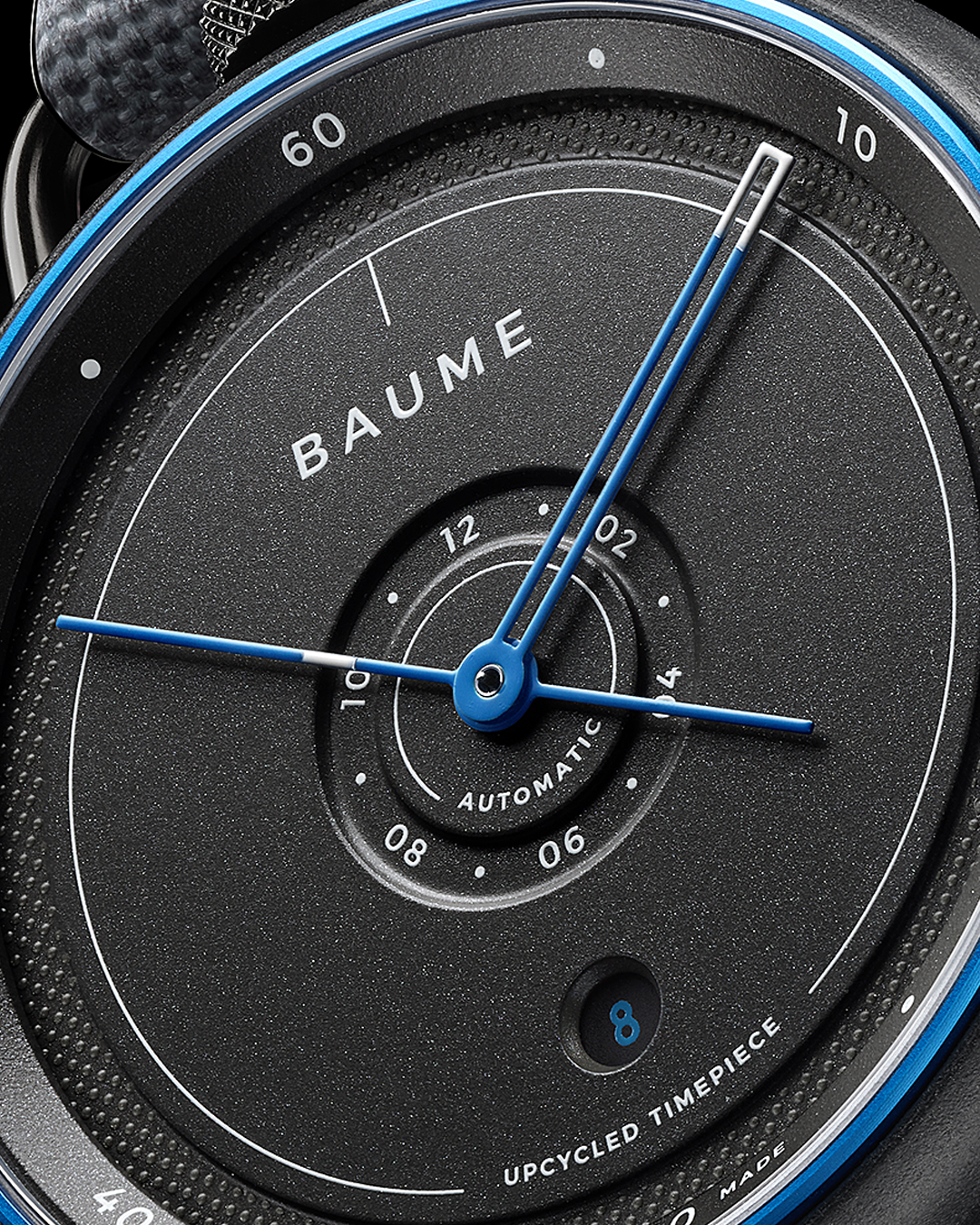 Available in two colours, blue or green, this new BAUME piece has a 42mm sized case (10.2mm thick) made of 80% recycled plastic from WFO that is reinforced with 20% glass fibres to increase its resistance. It is sheathed in either blue or green anodised aluminium, and has a crown at 12 o’clock – this final feature is characteristic of the BAUME models.