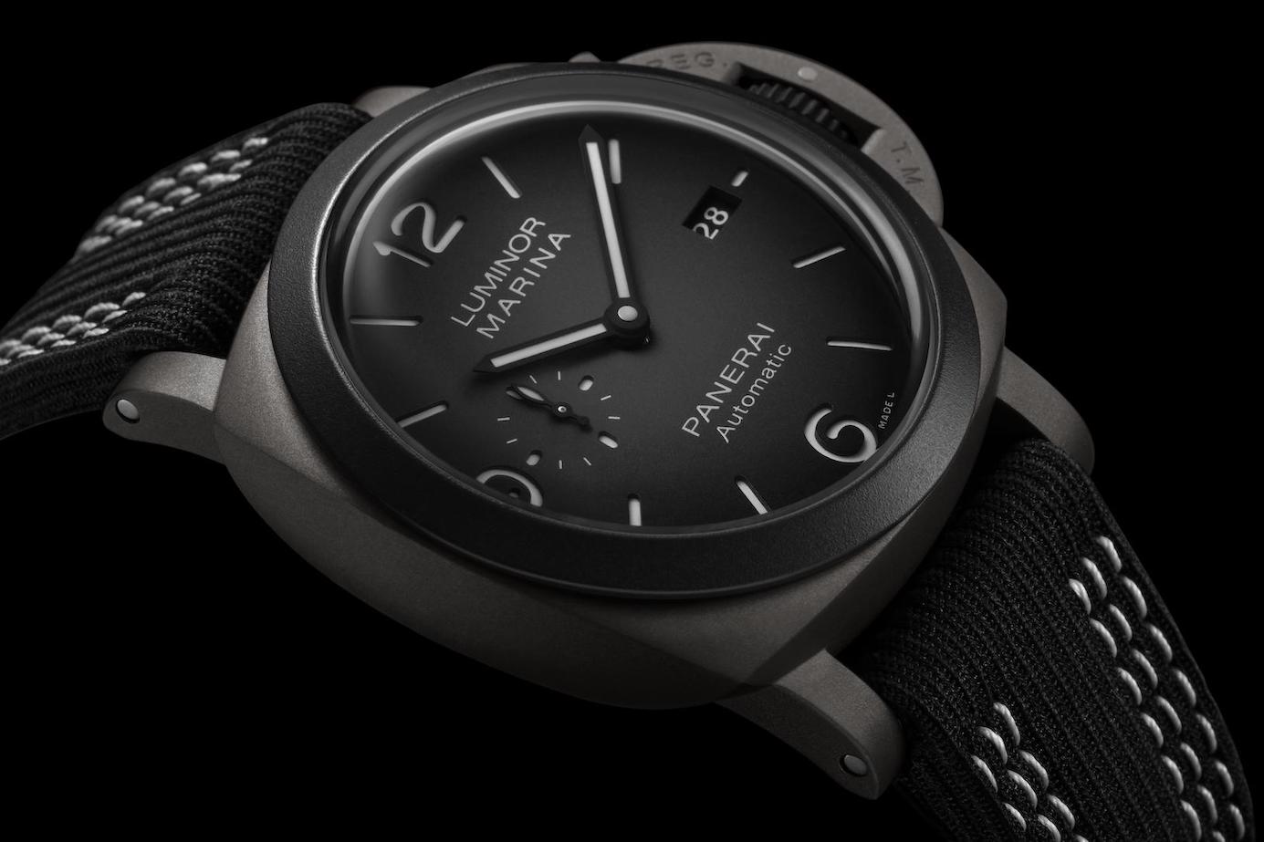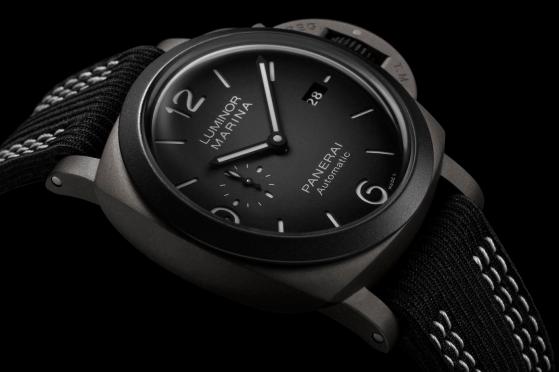 The new PAM1122 is in a sand-blasted DMLS (Direct Metal Laser Sintering) titanium case with 300m water resistance and has a rubberised coating applied to the titanium bezel, crown, and bridge lever.