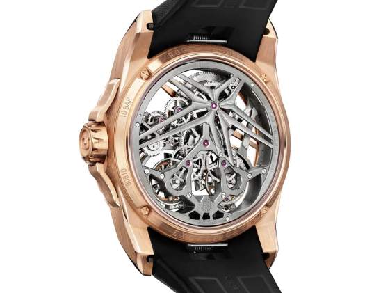 There are a number of changes in this new piece, including the prominent Roger Dubuis star-shaped bridge now placed freely above the barrel. The weight of the two one-minute flying tourbillons has been reduced through their lower cage being made of titanium and upper, in mirror-polished cobalt chrome. This weight reduction has been a factor in the increased power reserve (72 hours) in the new Calibre RD108SQ, an update of the RD105SQ, which was the first skeletonized movement with a double flying tourbillon connected with a differential. The new movement beats at 21,600 VPH, is connected to a new differential, and features a mix of finishing incuding circular graining, shot-blasting, and bridges finished with NAC coating.