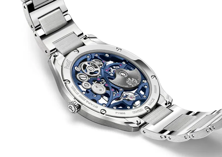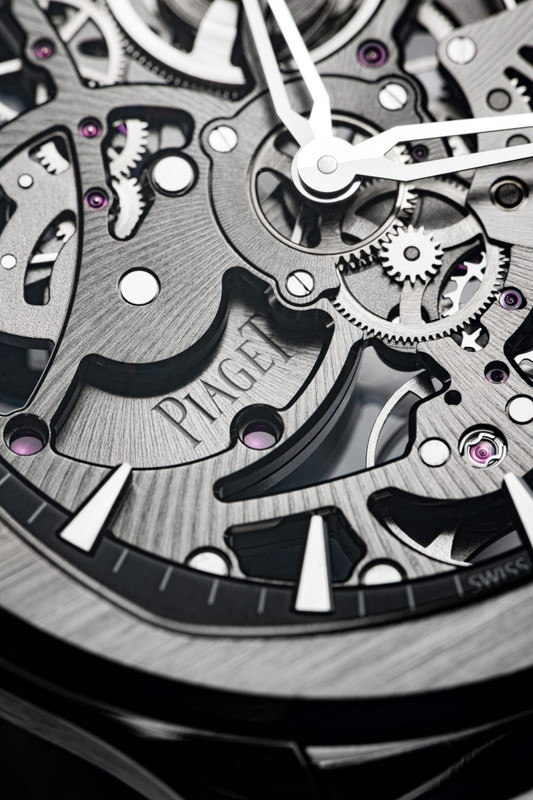 It is so thin in large part due to the use of the skeletonised ultra-thin automatic Calibre 1200S movement, which is 2.4mm thick. With a platinum micro rotor engraved with the Piaget coat of arms, it beats at 21600 VPH and has a power reserve of 44 hours. It is the same movement used in the Altiplano Skeleton models. The movement used for the Piaget Polo Skeleton has either PVD treatment or a slate grey finishing depending on the colour variant.