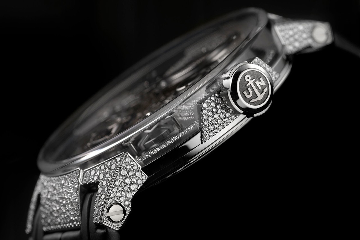 So we’re continuing on the ‘stones as far as you can see’ theme of the last post with the new Sparkling Free Wheel from Ulysse Nardin, a diamond-set version of its Tourbillon Free Wheel incorporating snow-setting.