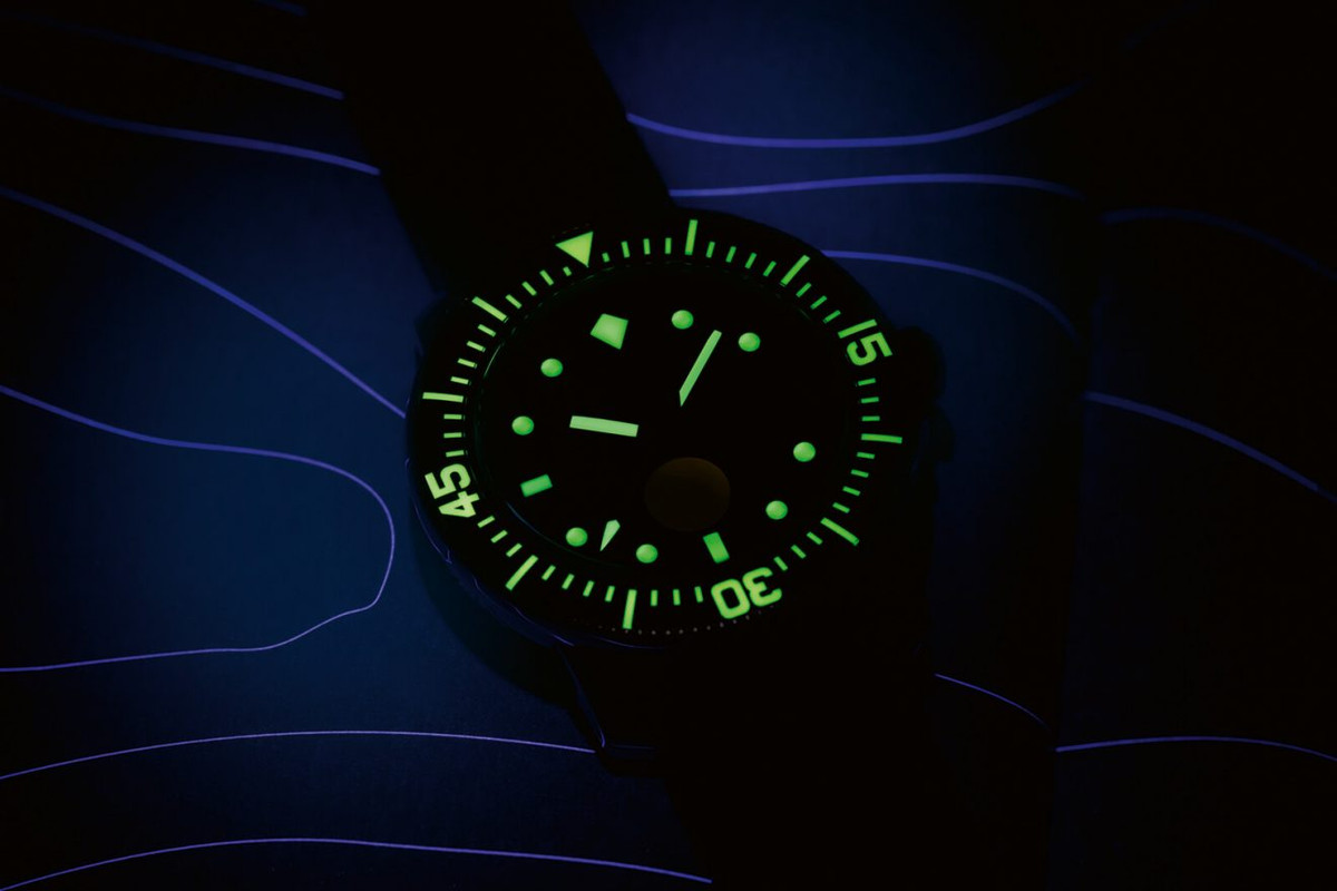 In a 40.3mm polished steel case with a water resistance of 300m, the new Tribute to Fifty Fathoms No-Rad has many of its 1960s forebears’ features. As well as the eponymous disc, it has geometrical hour markers and round dots that are from the original model, along with a diamond-shaped marker at 12 o’clock. The chapter ring, the hands and the time scale on the unidirectional bezel all feature beige faux patinated ‘old radium’-coloured Super-LumiNova. The white-framed date window at 3 o’clock echoes the RPGA-1A. A feature that is part of the Fifty Fathoms, a sapphire insert in the bezel, is also present in this new model.