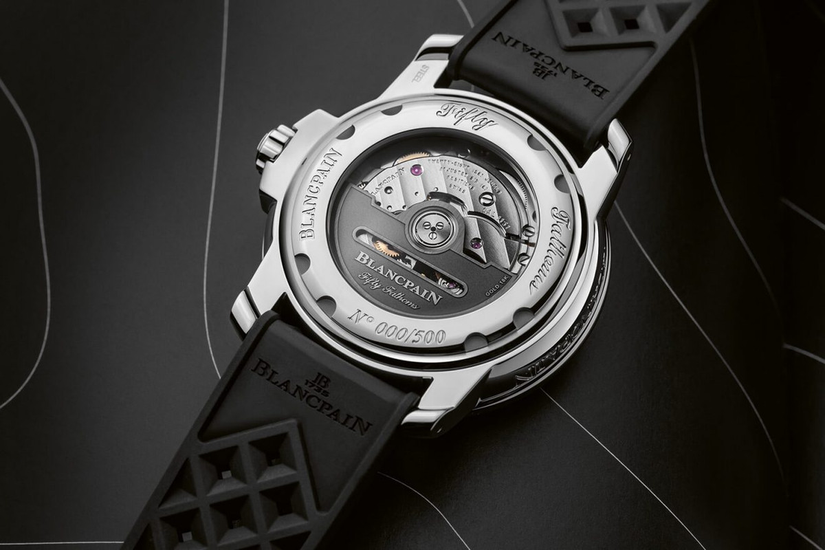 Inside is the automatic Calibre 1151 that is found in other models in the Fifty Fathoms range, including the MIL-SPEC from 2017 that was also inspired by a 1960s Fifty Fathoms. Beating at 21,600VPH, it has a four day power reserve, an NAC-coated rotor with an engraved Blancpain logo; and its balance spring made of low-density, shock-resistant, magnetism-impervious silicon. The latter feature negates the need for the soft iron inner case that protected this watch’s historical predecessors from the ill effects of magnetic fields, and has allowed Blancpain to put the finely decorated movement on display behind a clear sapphire case back.