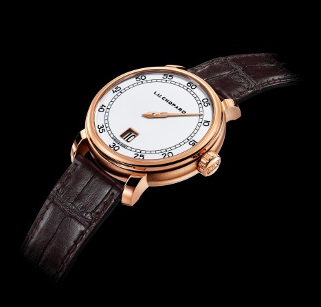 In case you’re wondering, no it’s not just he movement that is in-house. The enamel dial is as well. On an 18 kt rose gold base, it is repeatedly fired at 820°C before being polished into a subtle domed dial surface. The numerals, L.U.C. branding and railway track are all black enamel.