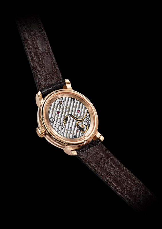 The 40mm case is made from ethically source 18 kt rose gold and features soft rounded curves. It frames a white Grand Feu enamel dial with a rose gold framed hour window at 6 o’clock, and the minutes circling the entire dial. Chopard’s rationale for placing the hour at 6 o’clock rather than 12 o’clock is that it means that the minutes hand will not obscure the window when there is a change of hours.