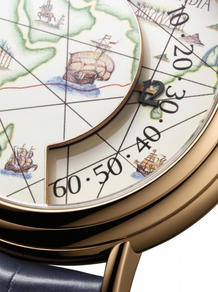 Again, his sea route is indicated in red enamel on the dial, in a faithful reproduction of the map in the Miller Atlas. The depiction of a ship includes details such as billowing sails.