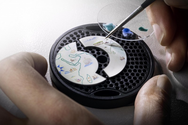 Each of the stunning dials of these new watches shows a part of the world and the maritime routes taken respectively by the three explorers. They take one month and eleven kiln firings to complete, with the process involving so many steps because of the complexity of layering the colour then the outlines, application of decorative details etc, each of which requires firing between them.