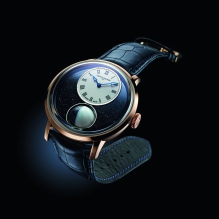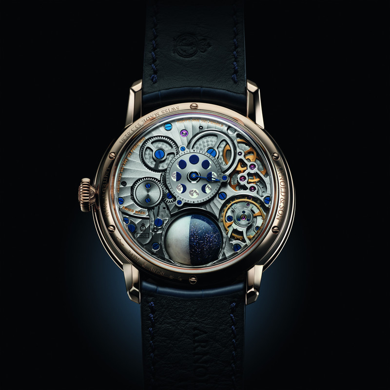 As well as the time and three-dimensional moon on the front, there is a ‘more detailed’ secondary moon phase indicator on the back, which requires a one day correction every 122 years. Changes to the moon phase and time-setting are both done via the single crown.