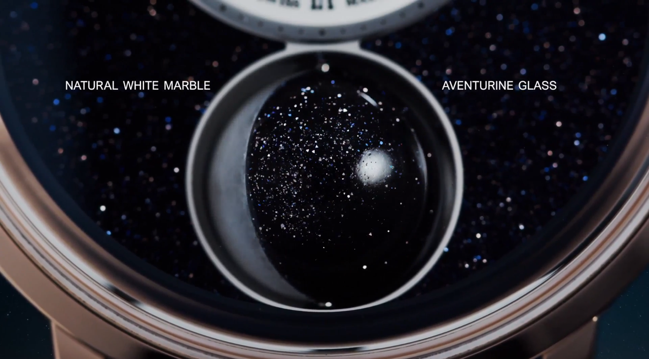 Beneath an off-centred white lacquered dial at 12 o’clock is the rotating sphere made from white marble and aventurine glass. The glittering aventurine dial that forms the background was chosen, of course, to represent the night sky.