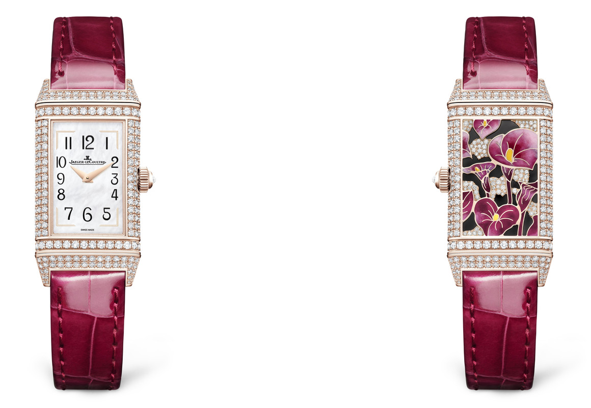 The arums of the Pink Arum Reverso One are depicted in enamel in various shades of pink, against a contrasting black lacquered background to highlight their colour. The leaves are diamond-set, there are grain-set diamonds all over the case, and the crown has a reverse-set diamond.
