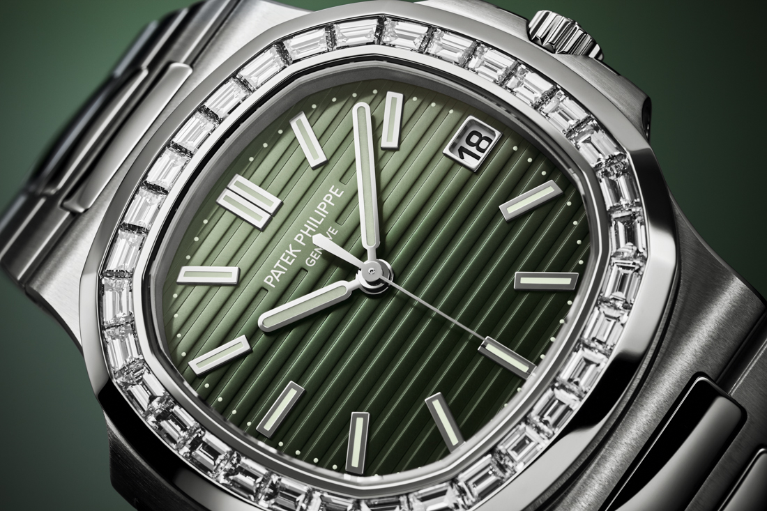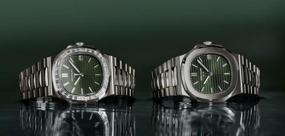 Meet the Nautilus 5711/1A-014 olive green and the Nautilus 5711/1300A, which has the same green dial but with a baguette diamond bezel.