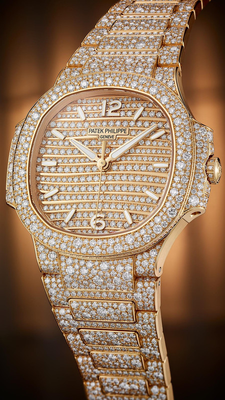As mentioned, there are also two new non-green models. The Ref. 5990/1 Nautilus Travel Time Chronograph is a new rose gold variant with a blue sunburst dial, and there is a Nautilus Haute Joaillerie model with a full diamond pavé setting with 2,553 brilliant-cut diamonds (total ~12.69 cts).