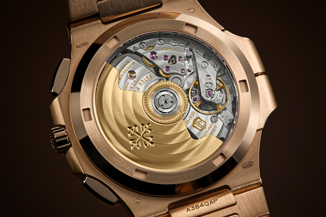 Through the open case back can be seen the automatic Calibre 26-330 S C, which has been used for the 5711 since 2009. It has a 21k gold rotor, beats at 28,800 VPH, and a power reserve of a minimum of 35 hours. It also features a sweep seconds and stop seconds feature.